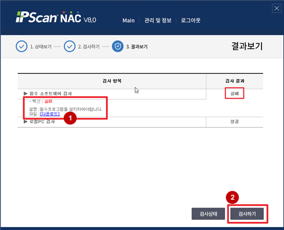 기타 메인으로 이동 기타 학교소개 입학안내 대학 대학원 학사안내 대학생활 동아광장 닫기 기타 기타 네트워크 차단 SNS 목록열기 FACEBOOK 공유하기 TWITTER 공유하기 BLOG 공유하기 KAKAO STORY 공유하기 SNS 목록닫기 인쇄 url 복사 NAC 에이전트 설치 단말 – 네트워크 차단1 사용 중 오른쪽 아래의 메시지는 클릭하여 확인 필요2- 교내 필수프로그램 미설치 단말기는 링크를 클릭하여 설치- 불법 소프트웨어가 설치된 단말기는 프로그램 삭제- 설치 및 삭제 완료 이후 검사하기 버튼을 눌러 검사 결과 ‘성공’ 확인